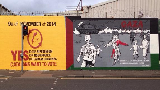 Falls Road és el carrer principal de Belfast, la capital nord-irlandesa; una llarga via carregada de simbolisme per als republicans irlandesos, lloc de peregrinació de molts activistes i simpatitzants de moviments d'alliberament nacional d'arreu del món. Són molt coneguts els murals que hi ha al llarg del carrer, i en els carrers adjacents, solidaritzant-se amb la lluita de tots aquests moviments. Des de fa uns quants anys n'hi ha més d'un dedicat als Països Catalans, i des d'ara n'hi ha un altra, en ocasió de la votació del 9 de novembre. Alguns usuaris a Twitter ja n'han difós fotografies, com la periodista @NoraMMC i el diputat de la CUP David Fernàndez: